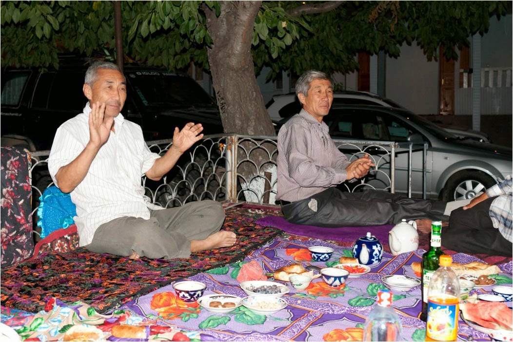 O 19 auto gotowe i sprawne. W zwiazku z tym niestety nici z meczu. Szkoda, ale reszta chce jechać. Życie… Ruszamy w stronę Doliny Fergańskiej. Za miastem Angren zjeżdżamy w jakieś wiosce w boczną drogę, która miast za wieś, doprowadza nas wprost na jakieś podwórko. A tam wielka biesiada, kilkunastu mężczyzn siedzi przy wielkim stole z jedzeniem. Już machają by wysiadać i zapraszają do siebie. Dobrze trafiliśmy. Okazja do świętowania jest, bo syn gospodarza będzie obrzezany. Całość trwa 3 dni, my trafiliśmy na koniec pierwszego. No to ucztujemy… Nawet alkohol się pojawił na naszą cześć. Jest bardzo wesoło i sympatycznie.