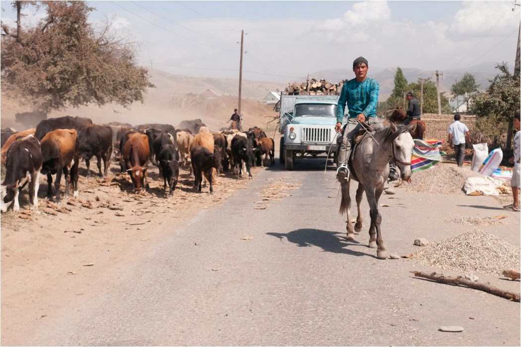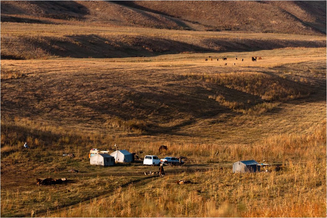 Rozbijamy się w góach wśród stad koni, krów, baranów. Wśród jurt i Kirgizów na koniach.