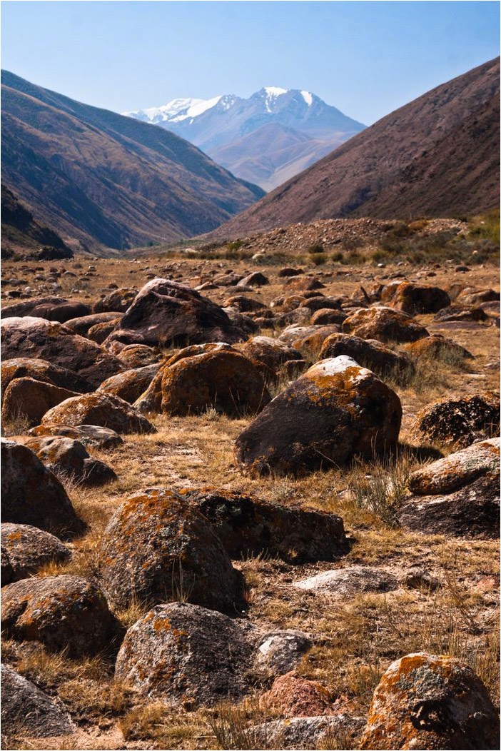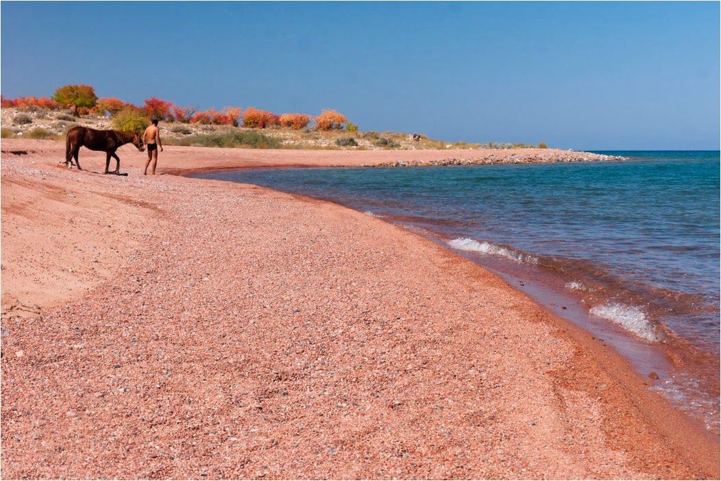 Zjechaliśmy na brzeg Issyk-Kul. Jezioro robi wrażenie. Jak morze. Leży na wysokości 1600m. Długie na 180 km a szerokie na 60 kilometrów. To drugie co do wielkości górskie jezioro na świecie. A wszystko w jesiennej i kolorowej szacie. Po drugiej stronie widać góry odległe o jakieś 70-80 kilometrów.