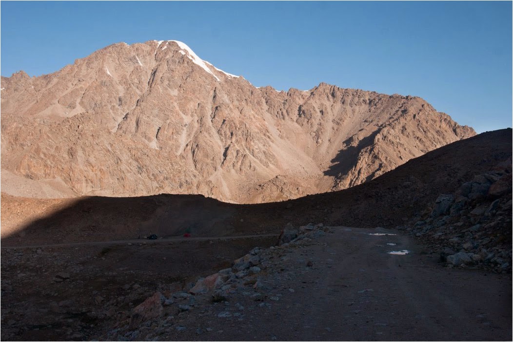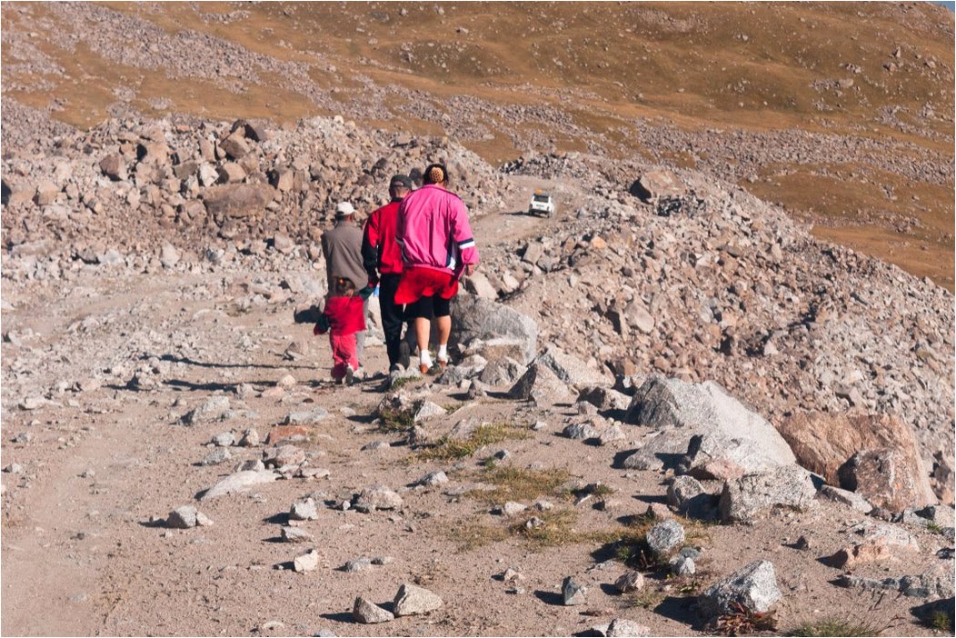 Zaczynamy zjazd w dół. Mija nas, jakże by inaczej, łada. Pasażerowie wyszli, by samochód mógł przejechać przez stosy kamieni niesłusznie nazywanych drogą. Widać nie jest potrzebny napęd 4×4, poczwiła łada wystarczy.