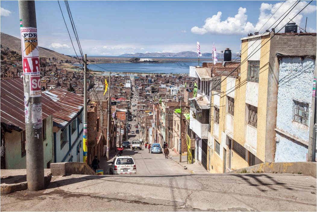 Wysiadamy na dworcu. Zanim wychodzimy sprawdzamy godziny odjazdu autobusów w stronę Boliwii.Wszystko wiemy, idziemy do portu. Mijamy rowery wodne o fantastycznych kształtach. Pelikany, smoki, mamuty, lwy… Nic tylko wsiadać i pływać. Woda niestety do najczystszych nie należy. Puno nie posiada żadnej oczyszczalni ścieków, wszystko więc spływa do jeziora.
