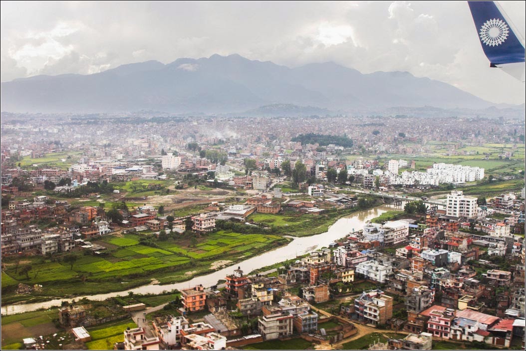W zasadze czasu na patrzenie nie było dużo, bo głównie zajmowaliśmy sie pysznym jedzeniem, którego było dużo, a jak wspominałem lot był dość krótki. Siedzieliśmy po stronie północnej, więc liczyliśmy, że zaraz zobaczymy wielkie Himalaje. No niestety, miast wielkich gór były wielkie chmury. Oznaczało to, że monsun jeszcze się nie skończył. Niestety. Z reguły powinien się cofnąć w drugiej połowie września, ale jak widać nie tym razem. Widoki w dół jednak usiłowały to jakoś rekompensować.