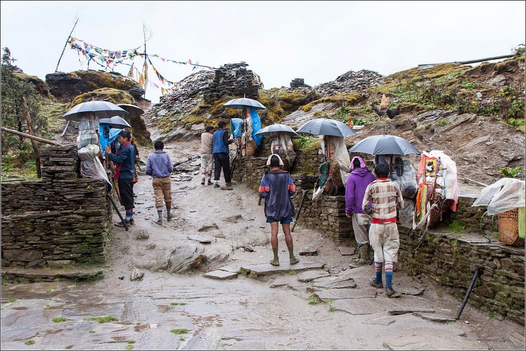 Wczesna pobudka. Od razu spodziewana niespodzianka. Leje. Gospodarz, wiedząc już o mojej zgubie, przynosi mi wielki niebieski wór foliowy. Nacina po dłuższym boku i już mam kurtkę przeciwdeszczową, trzeba ją tylko cały czas trzymać rękoma. Patrząc się na wszystkich tragarzy, widzę, że wszyscy mają ten sam model płaszcza 😉 Od razu nazywam go szerpatex. Jak pokazała późniejsza praktyka nie ma nic lepszego na chodzenie w monsunowym deszczu. Koszt niewielki – jakieś 100 rupii. Ruszamy. Pół dnia odpoczynku i brak plecaka działają cuda. Idzie się nadspodziewanie dobrze.
